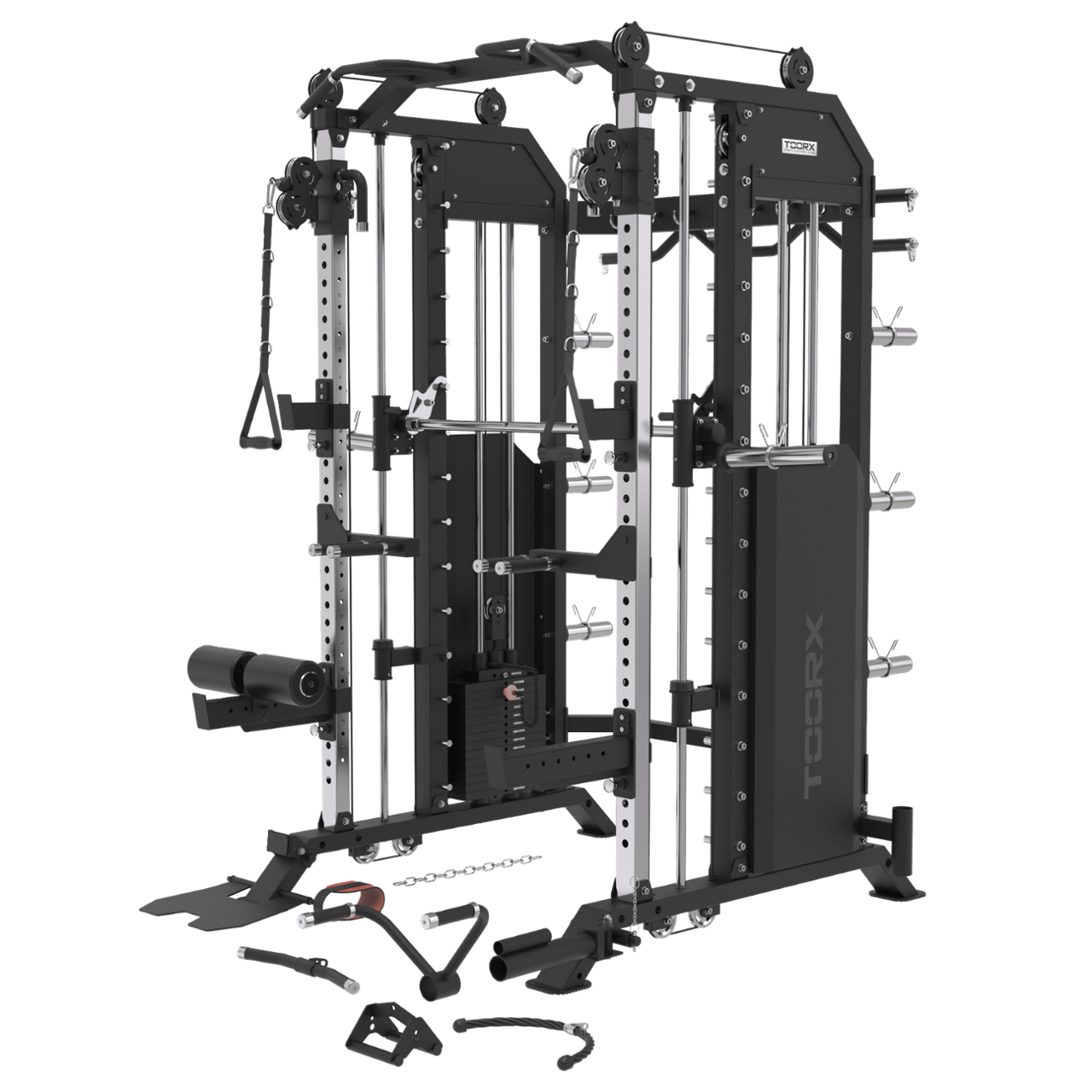 De ASX 6000 is uitgerust met maar liefst 18 aluminium katrollen voor een ongeëvenaarde soepelheid en vloeiendheid. En dat is nog niet alles: dankzij de speciale accessoires kan hij ook worden omgevormd tot een belt squat, een T-bar machine of een leg press, wat hem een ongeëvenaarde veelzijdigheid geeft.