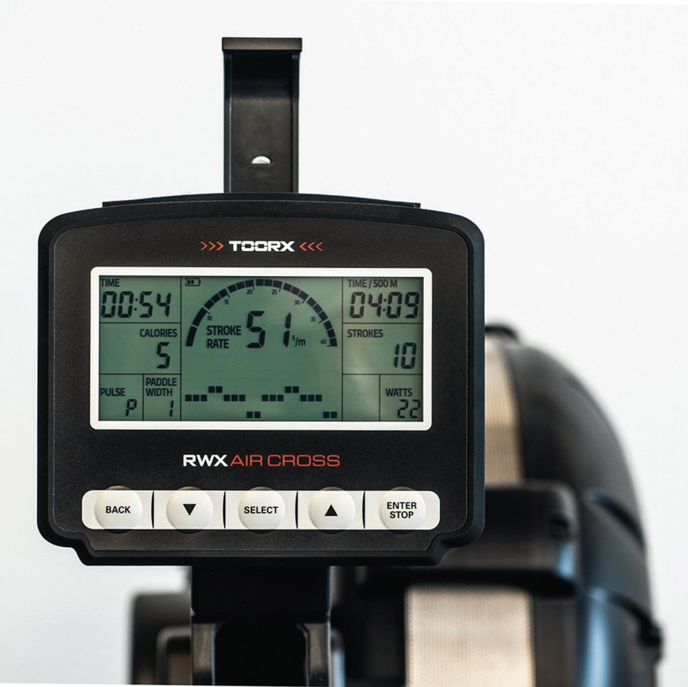 Informazioninumero vogate/min e totali, calorie, tempo, distanza, distanza/vogata, tempo/500 mt, pulse e Programmi di allenamento: game, time, distance, calories, 3 interval (serie selezionabili da 1 a 99), user, Watt.